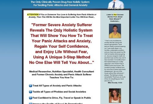 The Panic Miracle program is NOT another drug, psychological therapy or a set of breathing techniques. It is not the usual diet and herbal supplementation program or another over the counter medication that most people pass around. It is not a medical procedure either. This unique holistic approach and order of protocols to eliminate all types of panic attacks, phobias and anxiety and control their recurrence is for the most part unlike anything you’ll find elsewhere. Everything covered in the program is safe & natural. Moreover, instead of learning how to deal with a panic attack once it happens, you will learn how to free yourself from any future panic attacks and anxiety permanently. My program is NOT something that tries to fix the problem by swallowing pills to clam the fear. With my approach, you will be able to experience complete freedom from panic attacks while preventing their recurrence usually in less than 8 weeks.